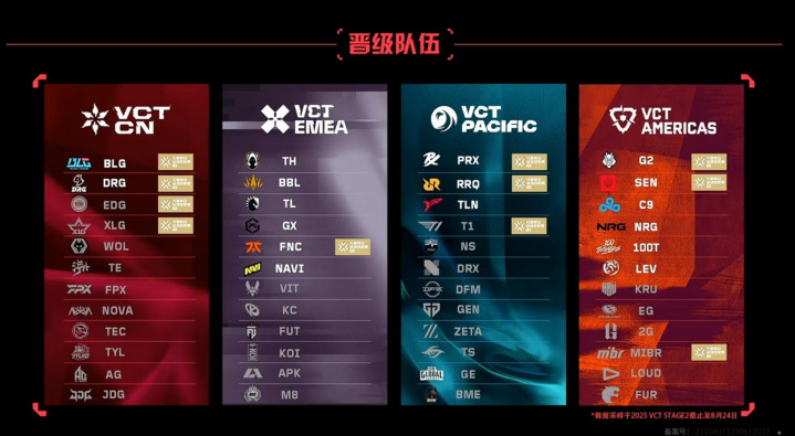 虎扑08月24日讯2025VCT四大赛区第二赛段,仅CN赛区已决出四支巴黎冠军赛队伍种子顺位,他们分别是: