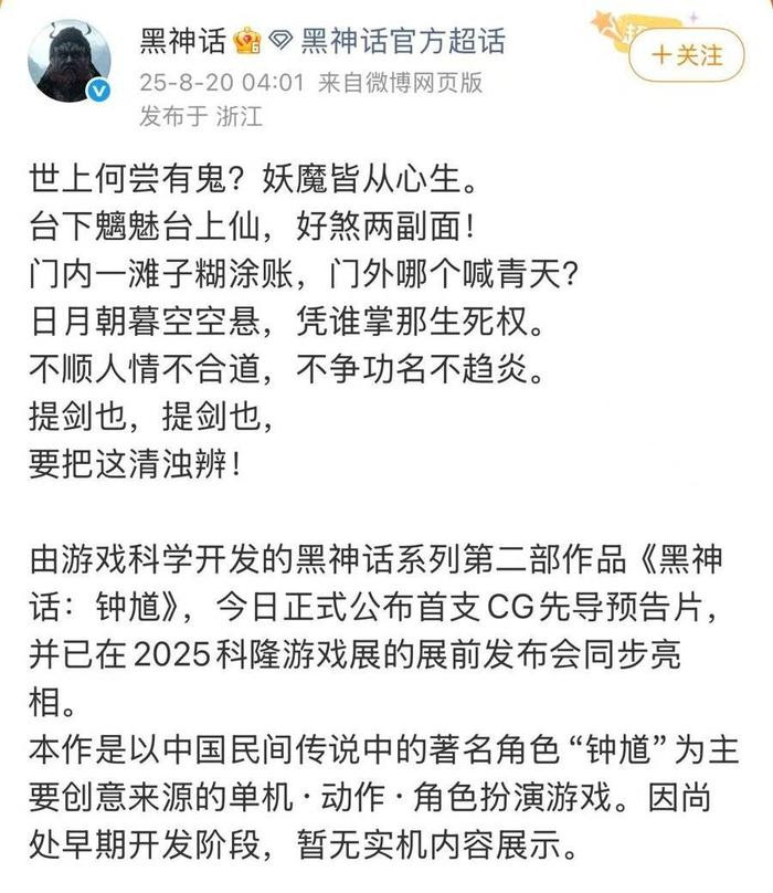 《黑神话:钟馗》首次曝光是在北京时间8月20日凌晨的科隆游戏展开幕之夜上,这一新作预告片压轴登场,迅速成为业界焦点。2023年科隆游戏展上,游戏科学团队开发的首个“国产3A大作”《黑神话:悟空》一举拿下最佳视觉大奖,成功点燃海外关注。今年游戏科学确认参展科隆时,很多玩家猜测是否会借此放出“大料”,只不过此前的猜测方向是《黑神话:悟空》的DLC(后续可下载内容),没想到等来的是一个更重磅的消息。