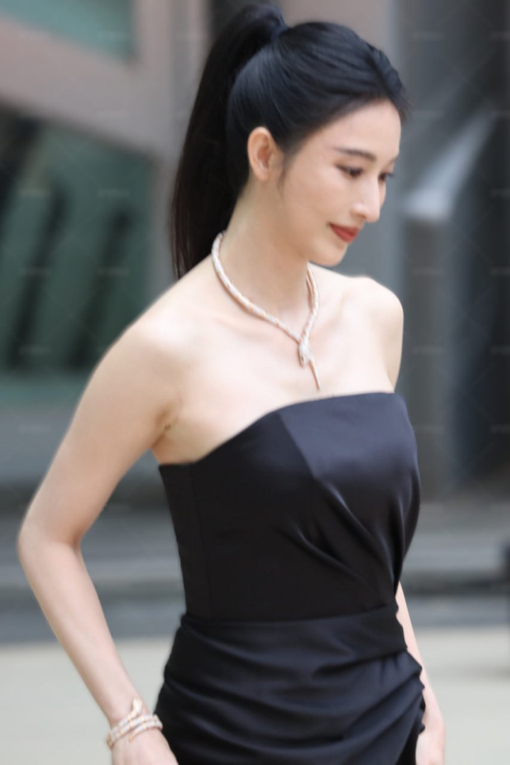 黑色抹胸裙简约而不失大气,光滑的面料贴合着她的身体曲线,将她的曼妙身姿展现得淋漓尽致。精致的抹胸设计,恰到好处地勾勒出她优美的肩部与颈部线条,彰显出一种自信与性感。裙身线条流畅,从胸部自然垂落,营造出优雅的垂坠感。