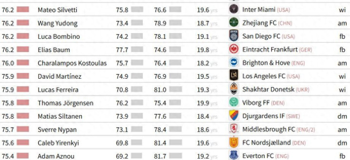这个榜单上,刚以420万欧转会费加盟迈阿密国际的阿根廷超级新星马特奥-西尔维蒂,与王钰栋总评分一模一样,都是76.2,他已经是梅西的锋线队友了。可以说,王钰栋的能力和表现已经得到世界足坛的认可,如果真能勇敢走出去,欧洲五大联赛都并非没有希望!(老邱)
