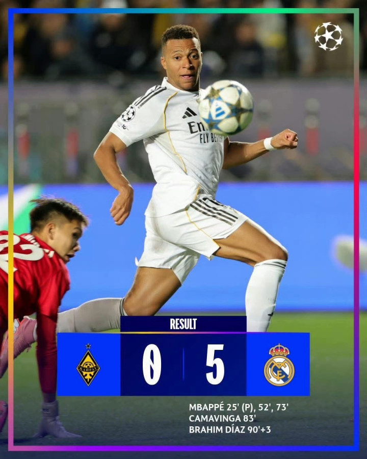 在本轮欧冠,皇马5-0大胜阿拉木图凯拉特,姆巴佩上演帽子戏法。