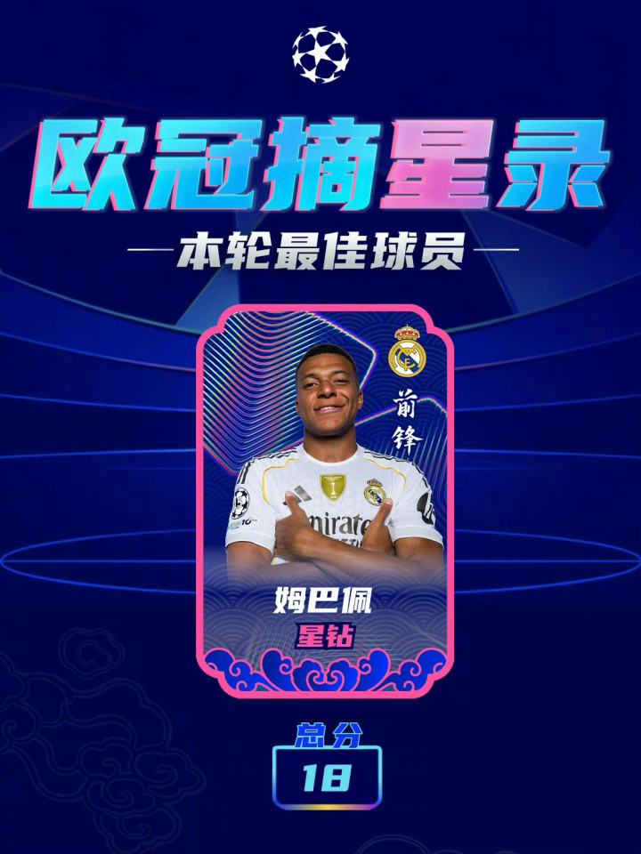 姆巴佩凭借出色发挥当选欧冠官方评选出的本轮比赛最佳球员,其他候选人包括哈兰德、海于格以及霍伊伦。
