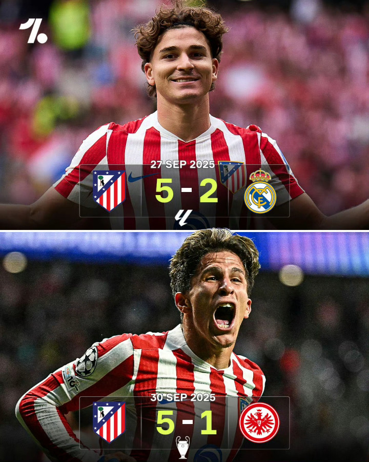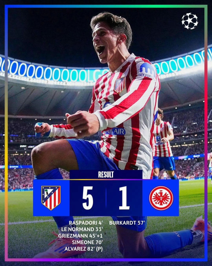 在首轮比赛结束后,排名积分榜首的不是那些老牌豪门或是冠军之师,而是德甲球队法兰克福,当然和首轮的对手相比,次轮他们需要前往西班牙挑战马德里竞技,这并不是一个级别的对手。马德里竞技在上场比赛中5-2击溃了皇家马德里,但欧冠首轮的失利让他们需要在接下来的欧冠比赛中争夺更多积分。开场后床单军团就拉满了强度,拉斯帕多里在第4分钟就取得了进球,此后虽然法兰克福占据了控球优势,但获得更多机会的明显还是马竞。第33分钟,勒诺尔芒打进了自己的欧冠首球,而上半场结束前格列兹曼打进了自己在马竞的第200粒进球,比赛悬念在上半场就终结了。下半场比赛中马竞主动收缩,法兰克福凭借伯卡特的进球扳回一城,但此后马竞凭借小西蒙尼和阿尔瓦雷斯的进球继续扩大领先,最终法兰克福在首轮5-1赢球的情况下次轮输了个1-5,而马竞在近2场比赛中打进了10球。