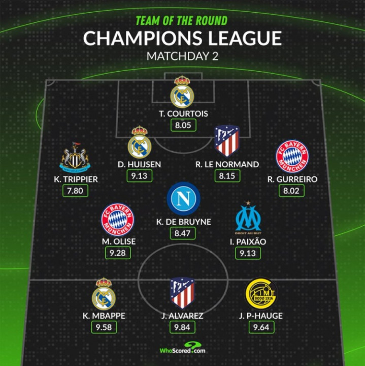 在如今的瑞士轮规则下,每支球队的对手是抽签决定的,但每支球队的对阵顺序依然是欧足联决定的,这就导致了与首轮更多势均力敌的对阵不同,大比分的结果更多出现在了第二轮比赛中,皇马、拜仁、马竞、国米、马赛和纽卡都收获了大捷。两轮过后有6支球队取得了两连胜,除了拜仁、皇马、巴黎、国米和阿森纳外,阿塞拜疆球队卡拉巴赫也“混入其中”,堪称开赛迄今的最大黑马。