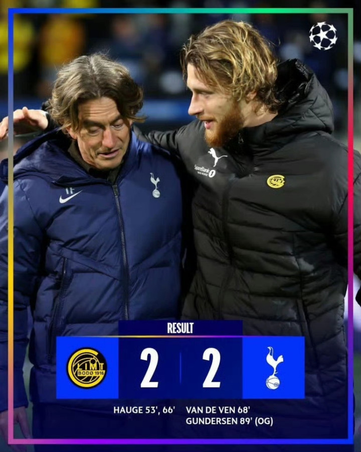 托特纳姆热刺则需要前往北极圈内迎战博德闪耀,即便错失了一次点球,博德闪耀还是率先打破僵局的一方,海于格的梅开二度让博德闪耀无限接近欧冠首胜,只不过热刺在随后振作了起来,范德芬头球破门后,热刺球员又制造了甘德森的乌龙,热刺艰难地从挪威带走一分。