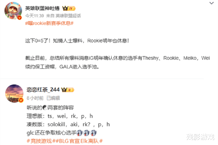 Rookie被曝休息,Wei续约保工资帽,一时间,全神班IG近乎垮台,队都要整散了。看到这个消息后,玩家们也是吃瓜不嫌事大,觉得IG摆烂不如直接解散。但恋恋红茶这边却又爆出两套阵容,分别为理想版和凑数版!理想版为:Theshy、Wei、Rookie、Photic、Hang;凑数版为:solokill、aki、rookie?photic、hang。这里之所以给Rookie打上问号,懂得都懂,这凑数版一眼望到头的阵容,rookie估计看了也不会打。