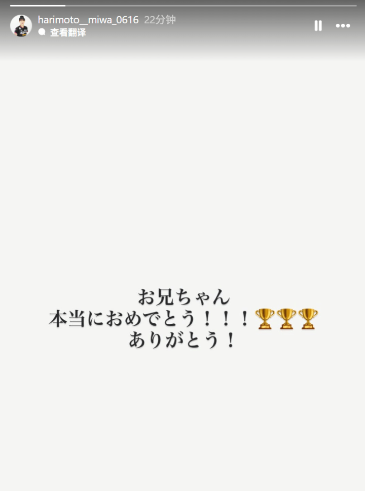 赛后,张本智和的妹妹张本美和也更新了社交媒体,发文庆祝哥哥夺冠。张本美和在社媒中这样写道:“哥哥,真的恭喜你!!!谢谢你!”