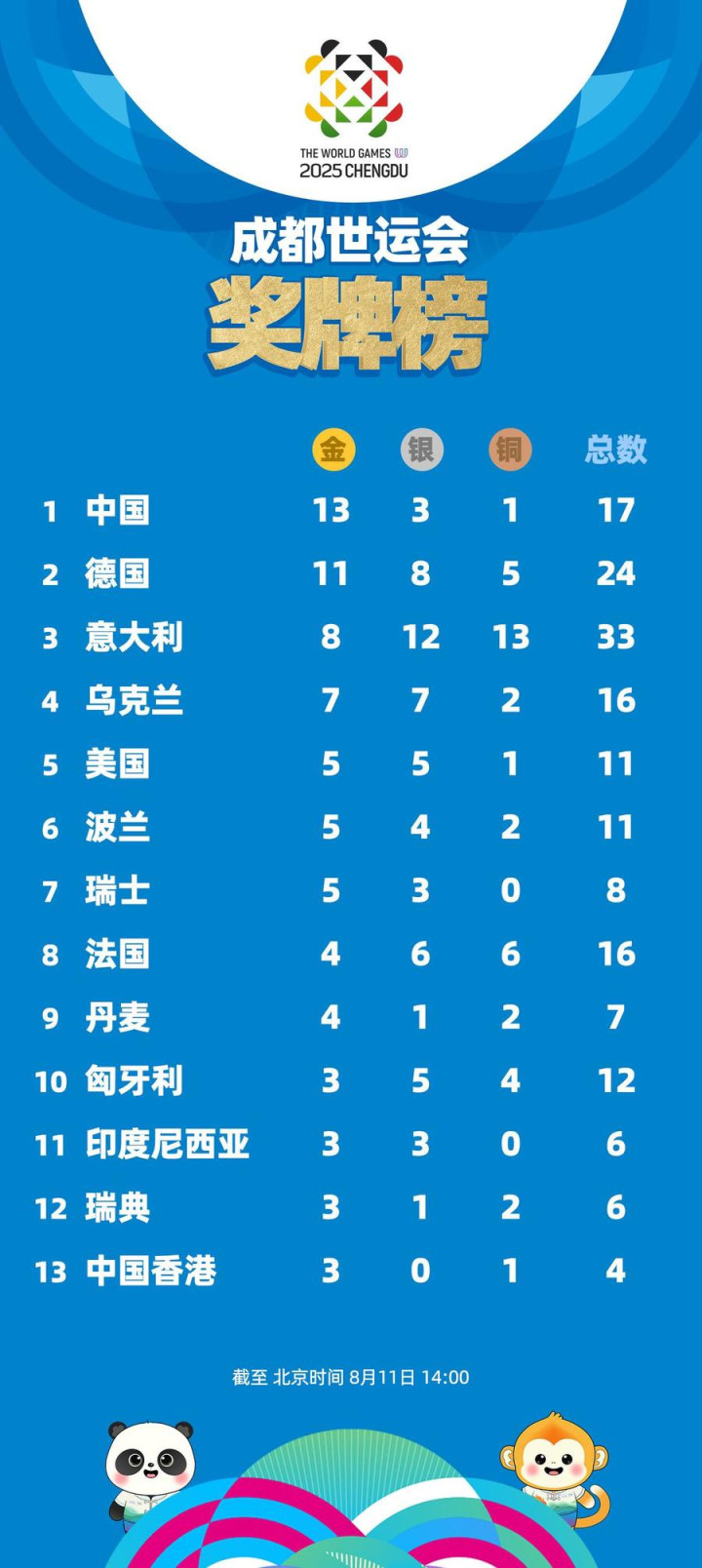 成都世界运动会奖牌榜: 中国13金跃居榜首