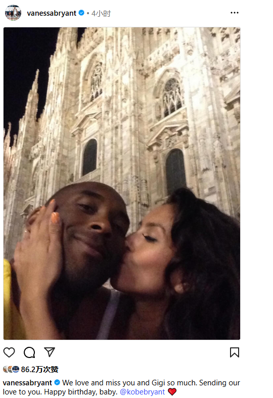 科比遗孀瓦妮莎更新社媒,晒昔日亲吻科比的旧照,配文写道:我们无比想念你和Gigi。把我们的爱送给你。生日快乐,亲爱的科比。