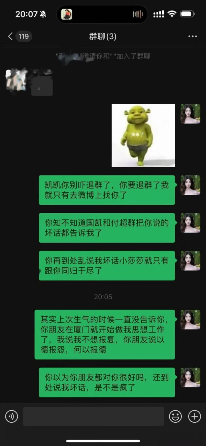 许荔莎表示最开始是因为许凯退群,为了好玩所以才和朋友设计了拿小号装是现任女友来刺激许凯,尽管许凯的粉丝早已发现小号内容并提醒团队,但连续三天,许凯及其团队选择完全沉默、不予处理。