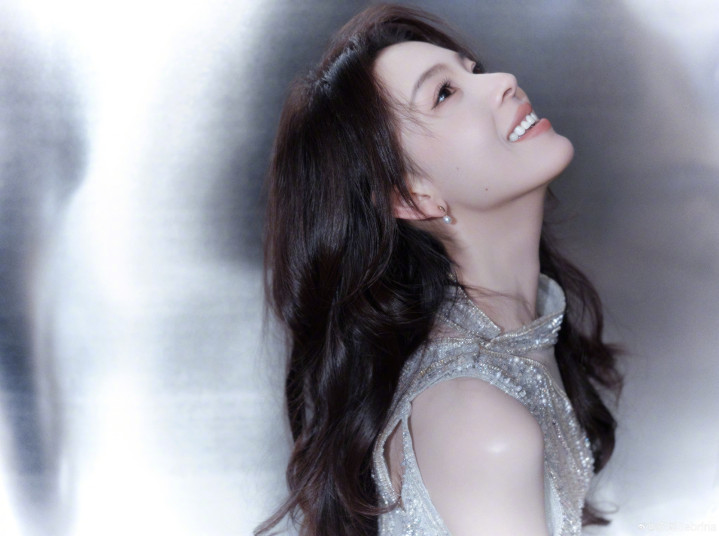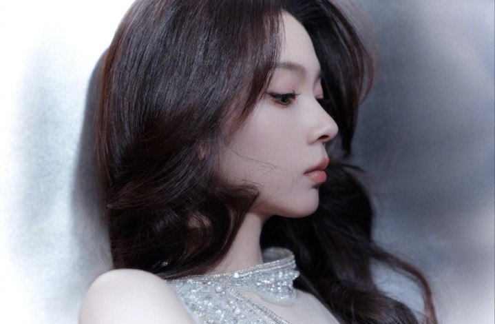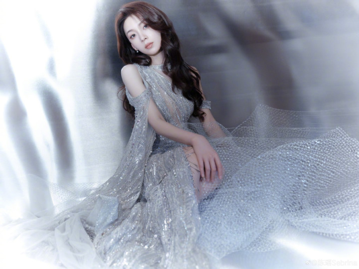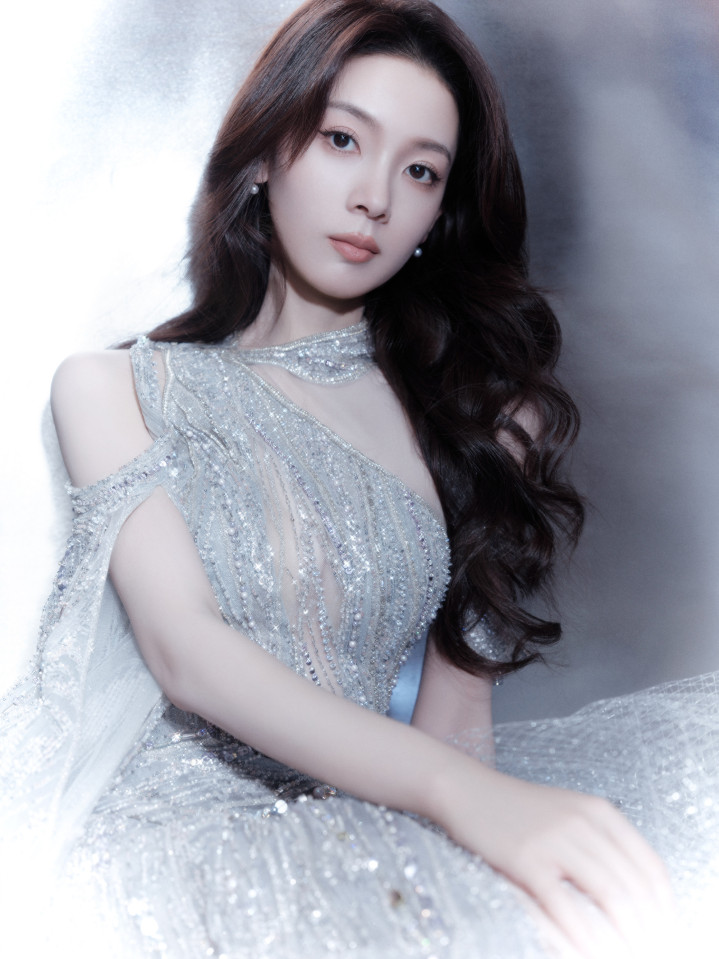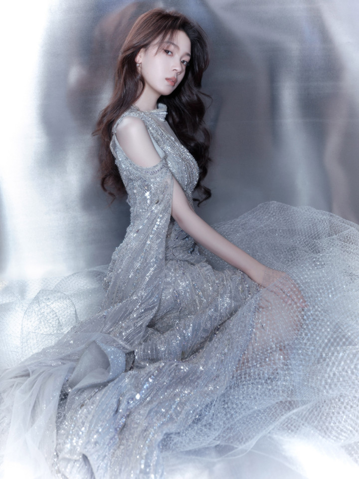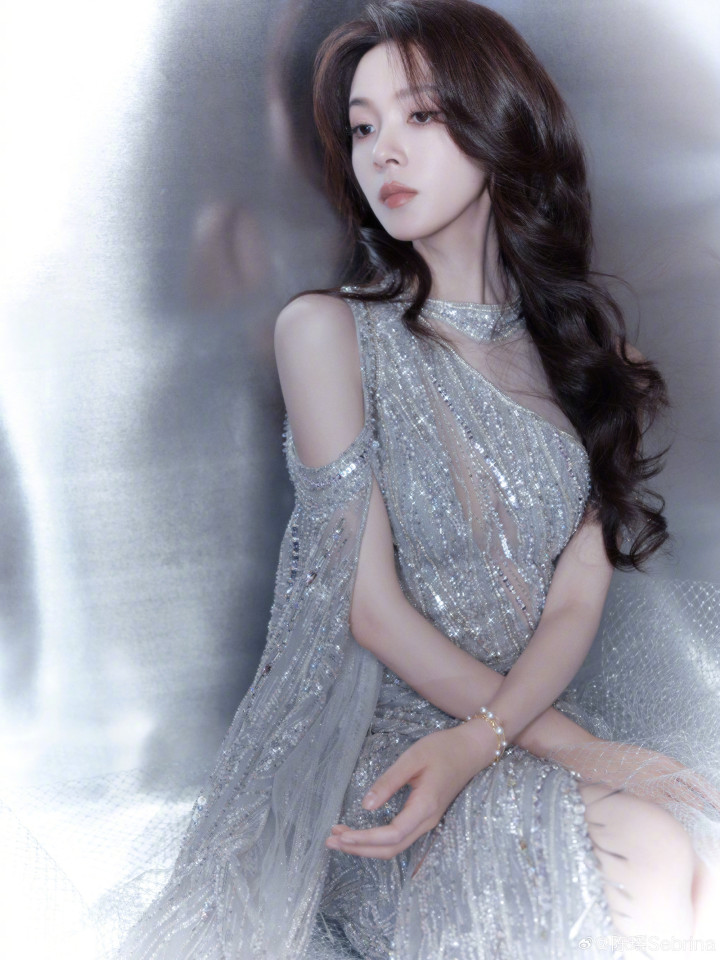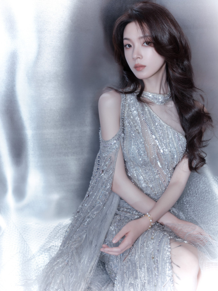 陈瑶身着单肩亮片银裙,姿态优雅,眼神沉静,散发温柔魅力!