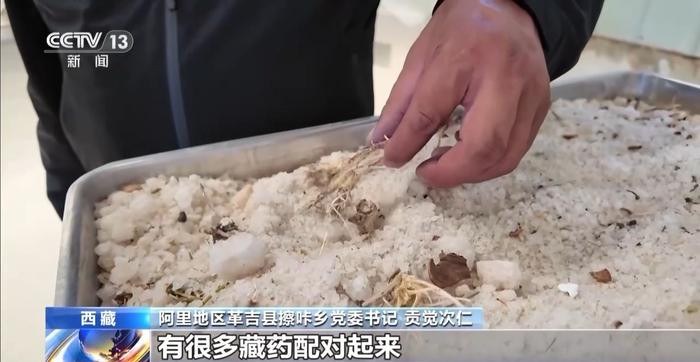 阿里地区革吉县擦咔乡党委书记贡觉次仁:这个就是足疗盐的原料,除了盐以外还有很多藏药,将原料先做初步的粉碎,然后进行混合,最后磨成跟面粉一样。