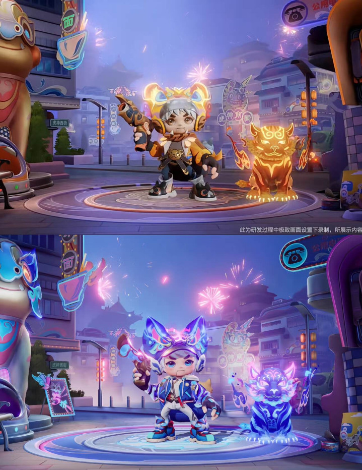 仔细看了一下这款皮肤的设计,其实形象方面除了颜色不同之外,并没有太大的改变,还是挺可爱的,局外展示的背景图也是改了一下颜色,多了一些细微的变化,比如在左边多了一个牌子,上面还写着5折。