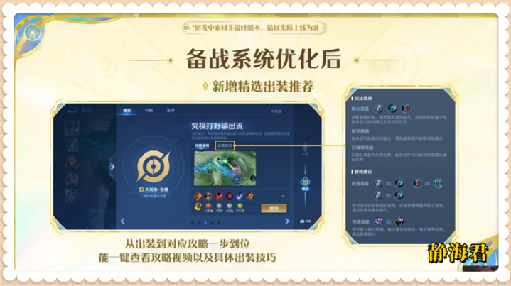 新赛季的备战系统大幅优化,后续常用英雄可以快速切换,优秀套装会在主页推荐,具体出装思路也会同步推荐。