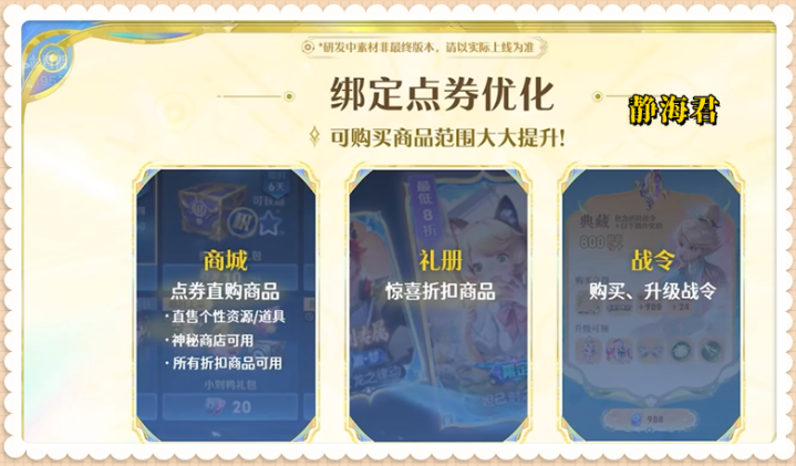 在新赛季只要是商城里直售的所有道具都可以用绑定点券来购买,就比如战令,比如月度礼册里的返场皮肤,比如商城里的天幕等。