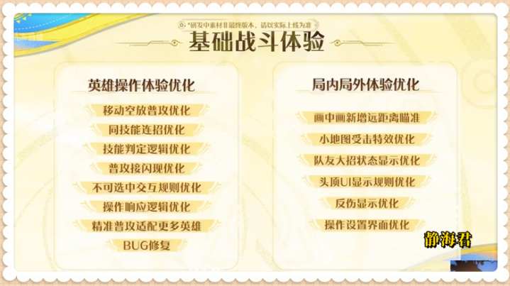 英雄操作方面:移动空放普攻优化、相同技能连招优化、技能判定逻辑优化、普攻接闪现的优化、不可选中交互规则优化、精准普攻适配更多英雄。