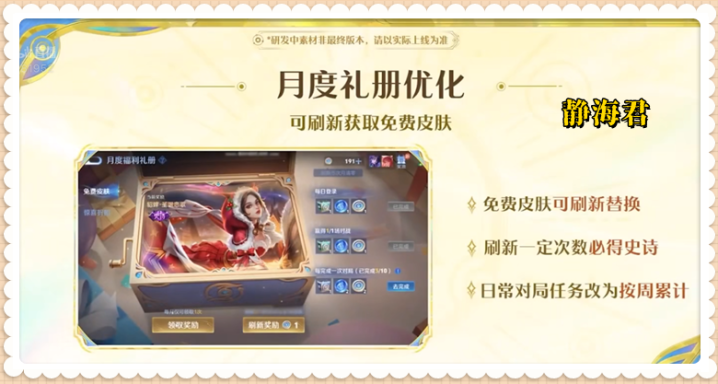 第一,免费皮肤的获取方式调整,后续玩家可以通过刷新来进行替换。