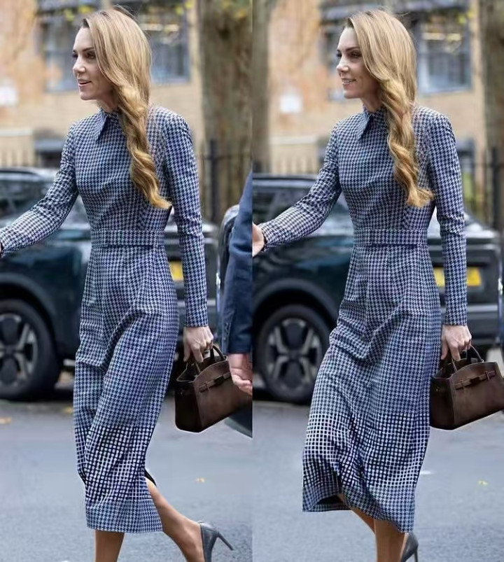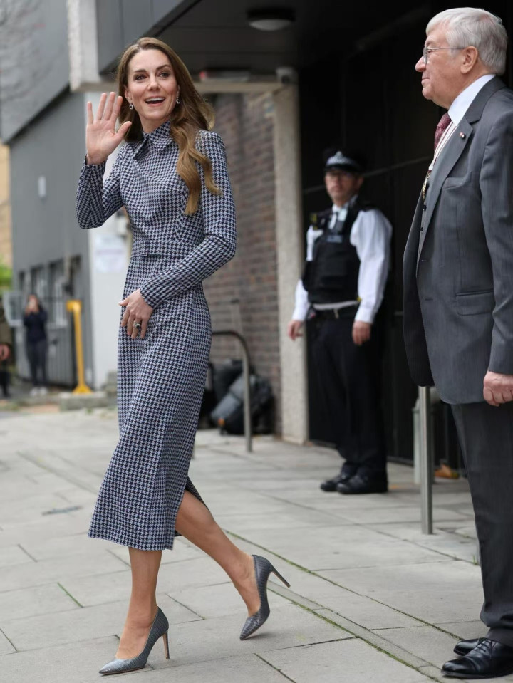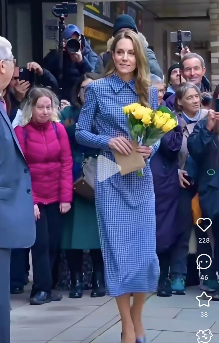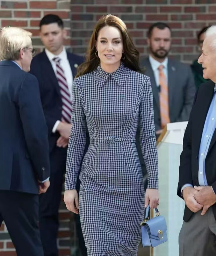 凯特这次穿了一件细密格子的蓝色连衣裙,版型很正,整体感也很好,可是跟她的身材却不太搭。